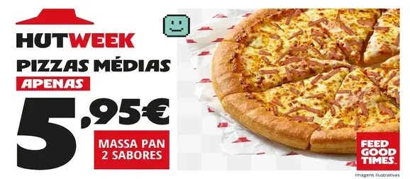 Serviço exclusivo para consumo no serviço à mesa dos restaurantes aderentes. Ofertas sujeitas a disponibilidade. Para mais informações consulta o colaborador de atendimento ou visita www.PizzaHut.pt/hutdeals. IVA incluído à taxa legal em vigor. Imagens ilustrativas.